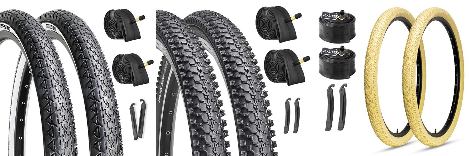 1. 2-Pack Cruiser Bike Tires Set: Hycline 26×2.125 Inch Folding Replacement Bicycle Tires and Pair 26-inch Inner Tubes with Tire Levers for Beach or Urban City Commuter Bike-White Walled