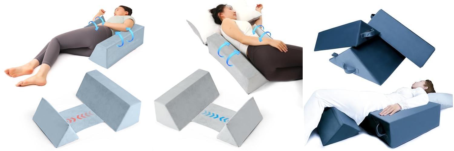 - The wedges help relieve back pain, reduce swelling in legs, and support hips or knees.