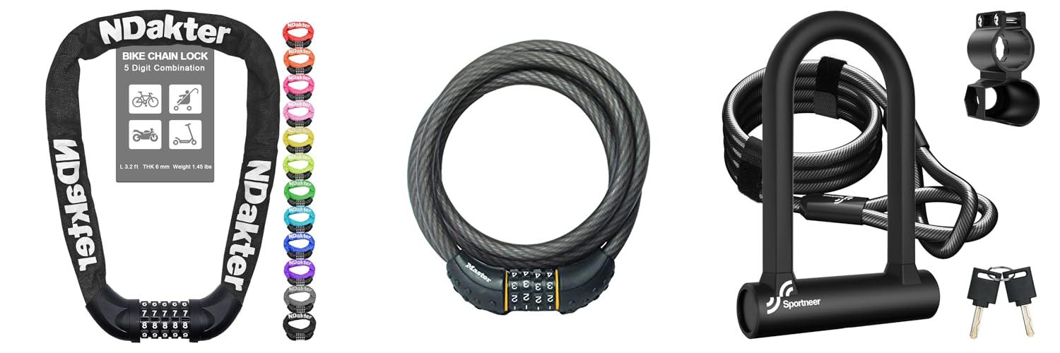 - U-Locks: Great for locking the bike frame to a bike rack or post. They are very secure.