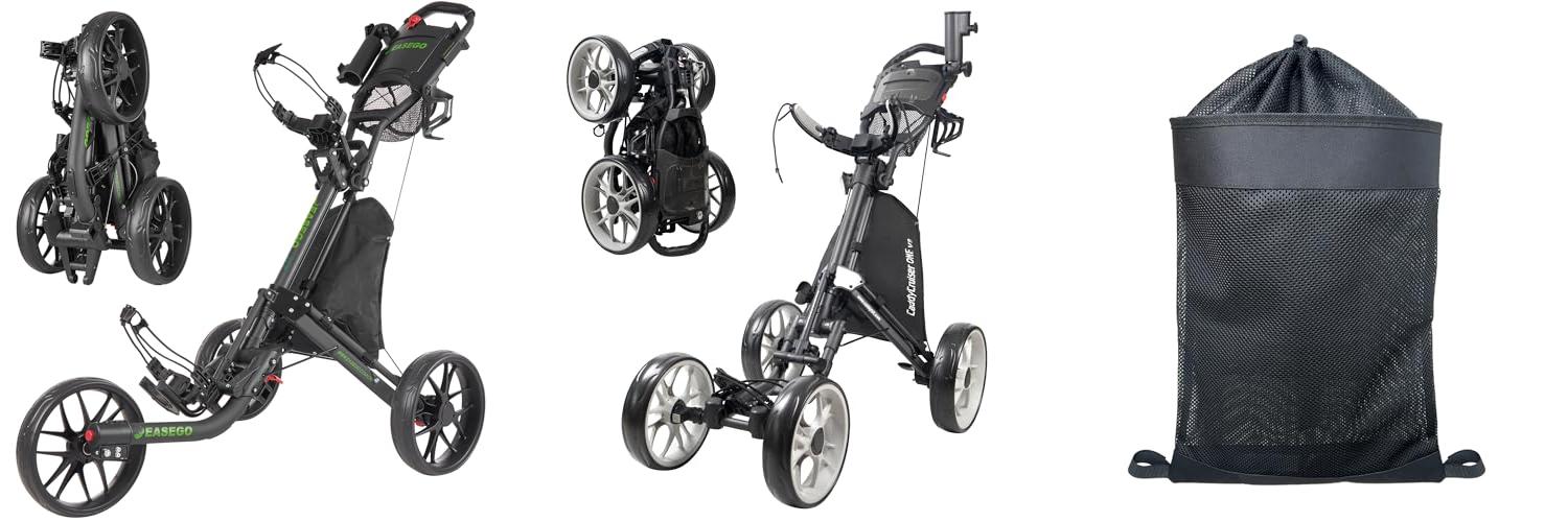 The EASEGO Golf Push Cart is a three-wheeled golf cart designed to make your golfing experience better. It’s foldable and has holders for your phone, cup, and umbrella. The cart is built to handle different terrains. It can easily fold up for storage and transport. This cart is made for golfers who want an easy and enjoyable way to get around the course.
