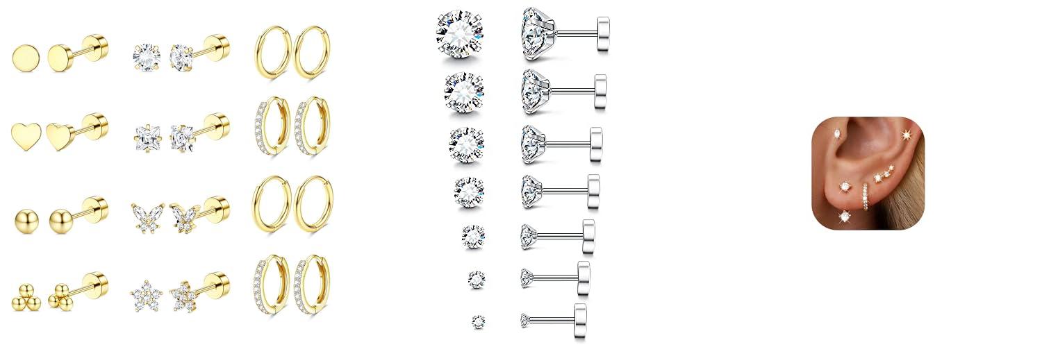 - You get a fantastic variety of 12 pairs – 8 stud styles and 4 hoop styles – so you can mix and match for different piercings and outfits.