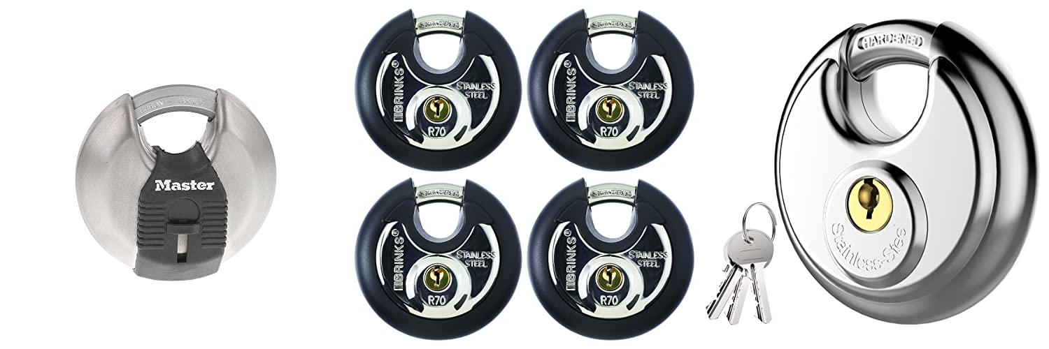 2. BRINKS Heavy Duty Padlocks & Keys 4 Pack 70mm Stainless Steel Keyed Alike Commercial Discus Keyed Lock for Storage Shed Garage Locker Sliding Doors Cabinets & More Round with Boron Shackle