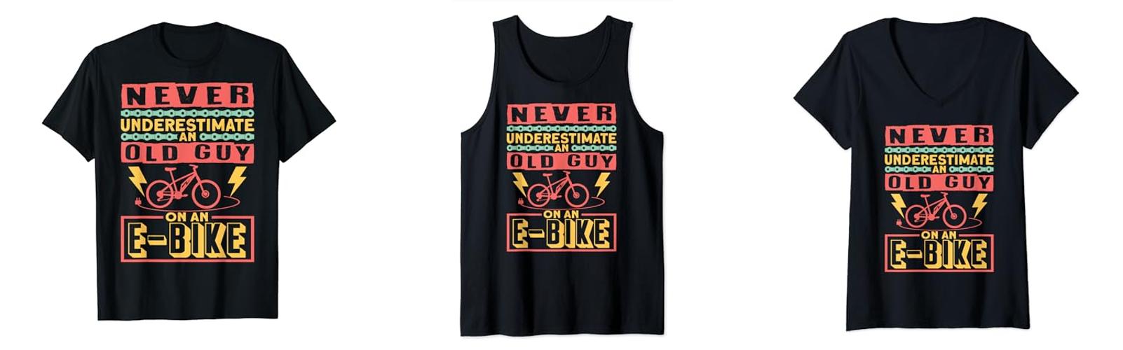 The “Never Underestimate An Old Guy On An E-Bike” V-Neck T-Shirt is a fun and comfortable choice. It’s a great gift for anyone who loves e-bikes.