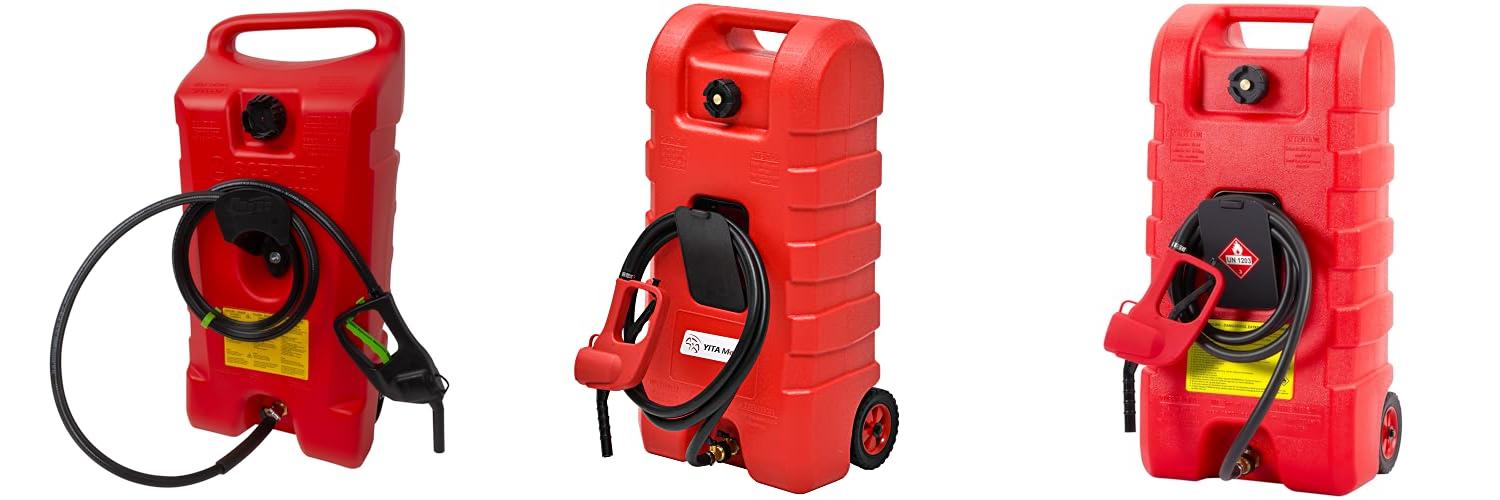 The YITAMOTOR Fuel Caddy is a 15-gallon fuel transfer tank. It’s portable and made for gasoline and diesel fuel. This red container comes with a manual transfer nozzle. It’s designed to help you refuel many things like lawn tractors and ATVs.