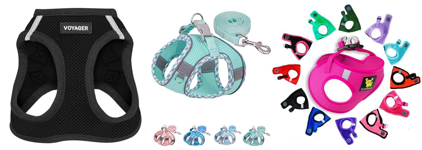 The Voyager Step-In Air Dog Harness is made for comfortable and safe walks. This harness is for small and medium dogs and cats. It has a breathable mesh and reflective bands. It uses a hook and loop fastener, a buckle, and double D-rings for safety. This harness is easy to put on and take off.