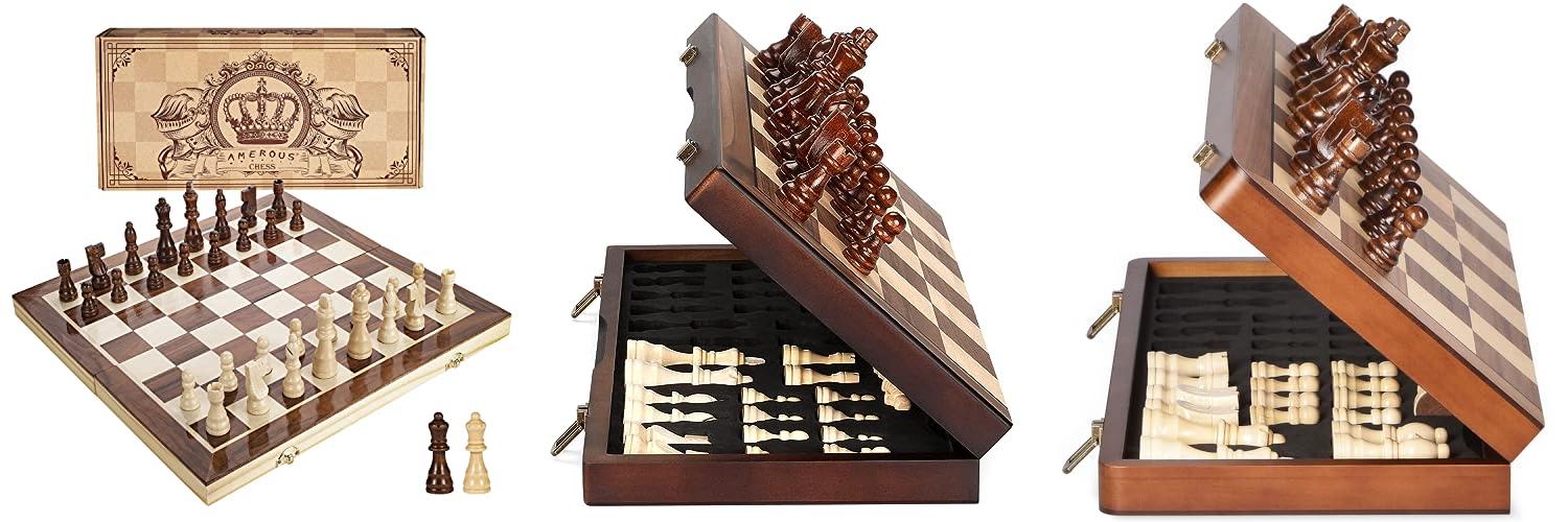 1. AMEROUS 15 Inches Magnetic Wooden Chess Set – 2 Extra Queens – Folding Board – Pieces Storage Slots