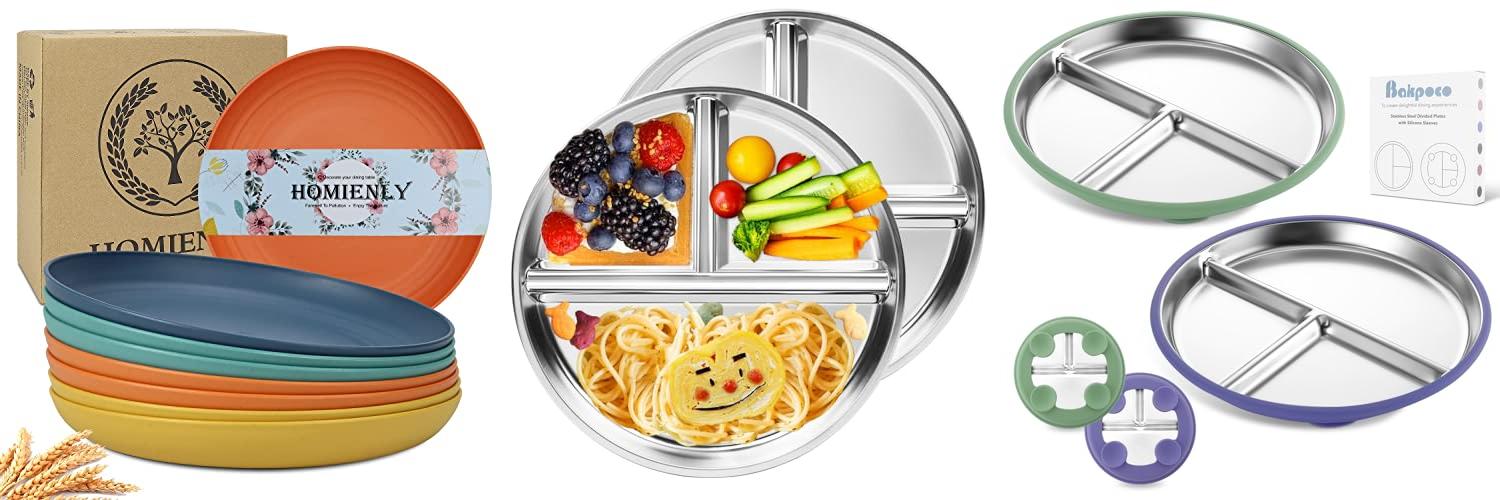 - The plates have three sections. This helps you eat a balanced meal with vegetables, protein, and grains.