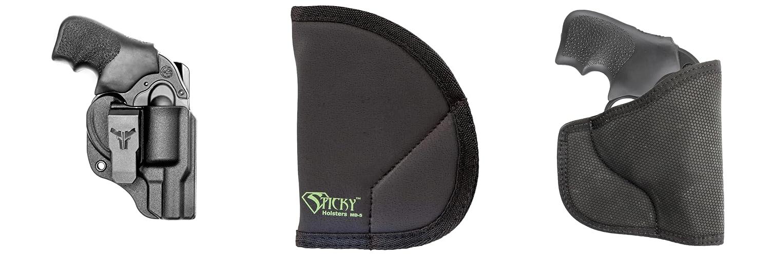 The Sticky Holsters MD-5 is a smart choice for concealed carry. This holster is for both men and women. It fits J-Frame revolvers, Kimber K6s, Ruger LCRs, and similar guns. It works with guns that have up to a 2.25-inch barrel. You can carry it inside your waistband or in your pocket. It is made for both left and right-handed users.