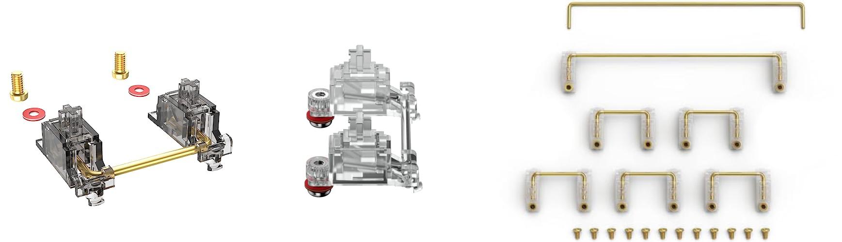 - The kit includes all the necessary stabilizers (5 x 2u, 1 x 6.25u, 1 x 7u) along with gold-plated wires, screws, and washers.
