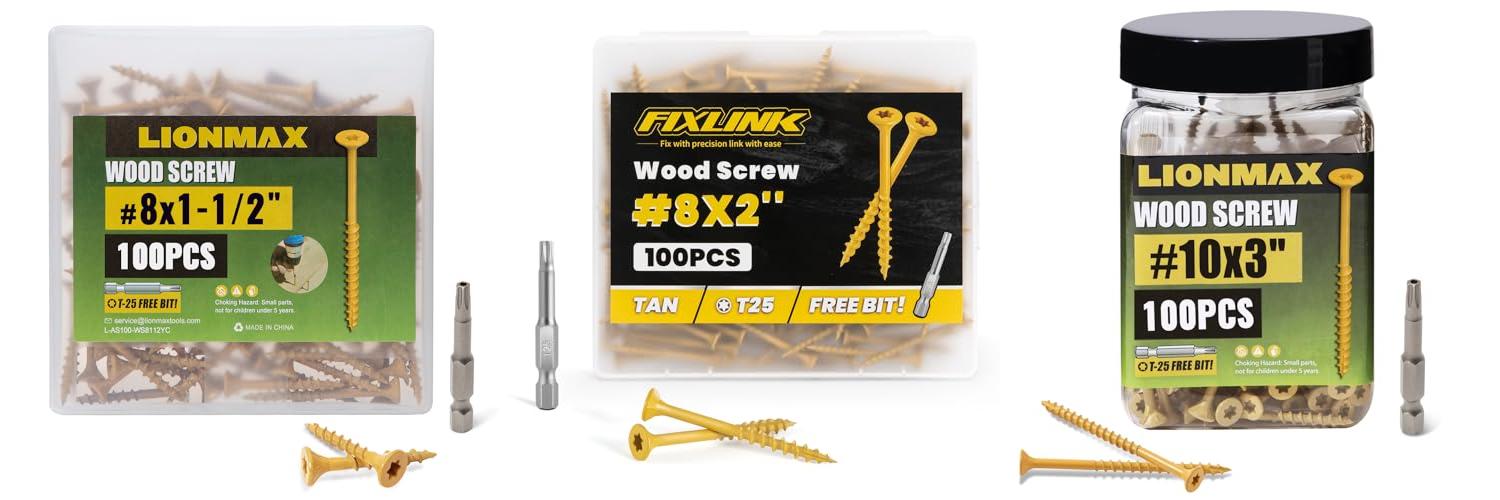Building or repairing outdoor projects just got easier with LIONMAX Wood Screws. These #8 x 1-1/2 inch deck screws are built tough for all your exterior needs. They come in a pack of 100 and include a T25 star bit, making them ready to use right away.