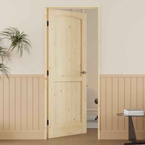Looking for a classic and sturdy interior door? This 30” x 80” 2-Panel Wood Door from AINLARRY is a fantastic choice. Made from natural solid knotty pine, it brings a touch of rustic charm to any room. Its arch top design adds a touch of elegance, making it suitable for various spaces like pantries, bedrooms, or living areas. This door slab is ready for your personal touch, allowing you to stain it to perfectly match your home’s style.