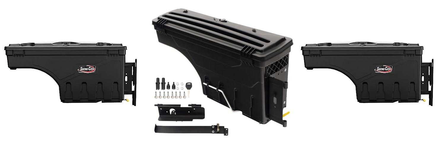 - Easy Access: The SwingCase swings out almost 180 degrees, letting you grab your tools or supplies without reaching over them. It locks securely over the wheel well when not in use, giving you back your full bed space.