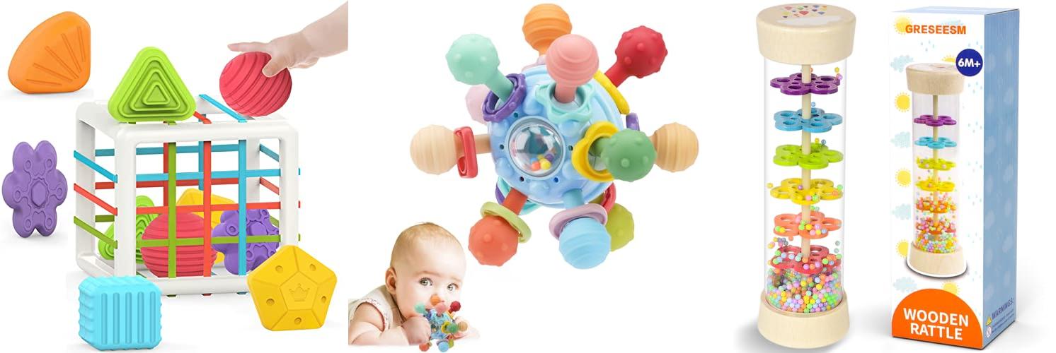 • Motor Skill Development: Toys that encourage reaching, grasping, and transferring objects help fine-tune motor skills. Shape sorters (with large, safe pieces) and simple puzzles are great for this.