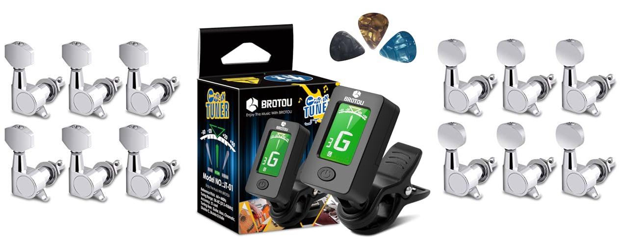 The Holmer Sealed String Tuning Pegs are made for your guitar. These tuning machines are designed for both acoustic and electric guitars. The set includes three left and three right tuners. They are chrome-colored and made from strong zinc alloy. They will replace your old, broken tuners. The tuners have a 1:14 gear ratio for smooth tuning.