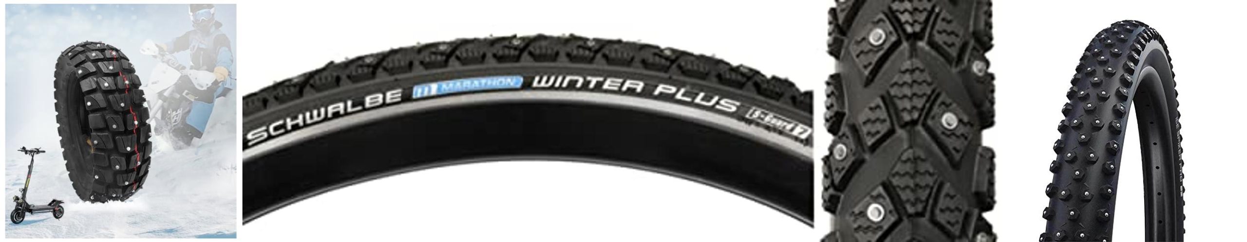 • Studs: If you ride on icy paths, studded tyres are a must. They have small metal spikes that bite into the ice. The more studs, the better the grip on ice.
