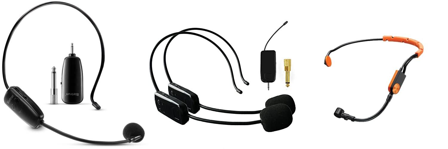 • Headset Mics: These go over your head and the mic sits near your mouth. They are great because they stay in place during jumping jacks and other exercises.
