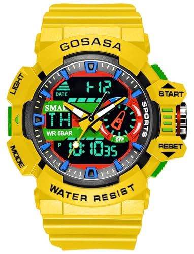 1. GOLDEN HOUR Mens Waterproof Digital Sport Watches Wide Screen Easy Read Display Military Style with Yellow Rubber Strap